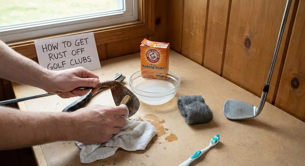 Forget expensive specialty products; white vinegar is your best weapon against rusty golf clubs. Submerge the clubhead in undiluted vinegar for 15-20 minutes, then scrub the grooves with a stiff-bristle brush. For stubborn spots, make a baking soda paste and let it sit for 20 minutes before scrubbing. Rinse thoroughly with clean water and dry completely to prevent new oxidation. The real turning point, though, is what you do after the rust is gone.