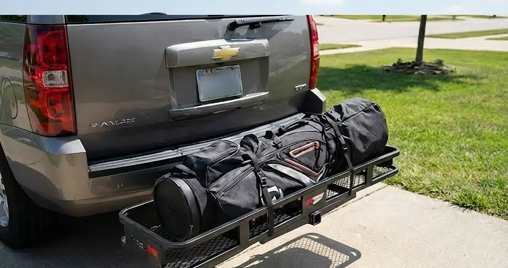 Man securing golf bag on car roof rack
